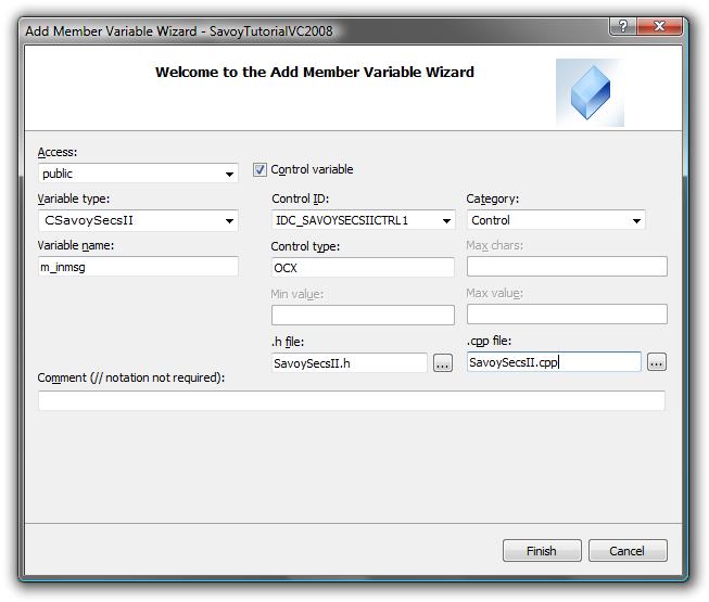 4. 同様にSavoySecsIIにも変数を割り当てます。 Variable typeをCSavoySecsIIに変更し、.h fileと.cpp fileもそれぞれSavoySecsII.h、SavoySecsII.cppとします。 Variable nameはm_inmsgおよびm_outmsgとします。