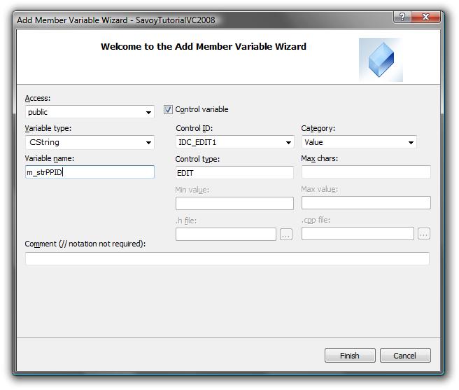 3. Variable typeをCSavoyHsmsに変更し、.h fileと.cpp fileもそれぞれSavoyHsms.h、SavoyHsms.cppとします。 Variable nameはm_hsmsとし、Finishボタンをクリックします。